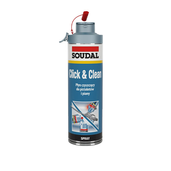 Płyn czyszczący do pistoletów na zawór Click & Fix firmy Soudal. Czyści wszelkie powierzchnie z pianki montażowej.